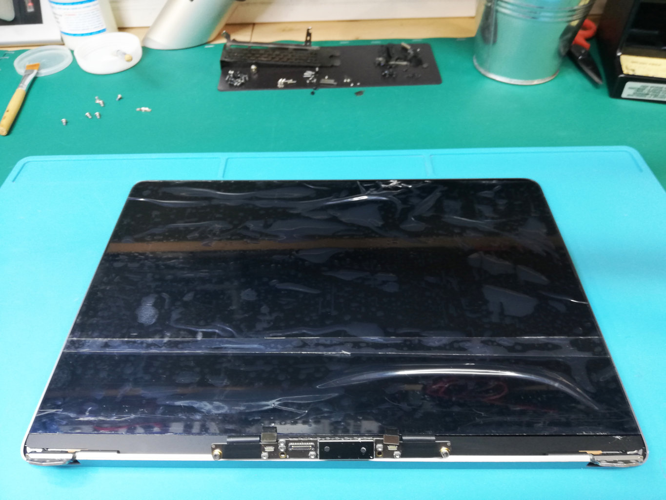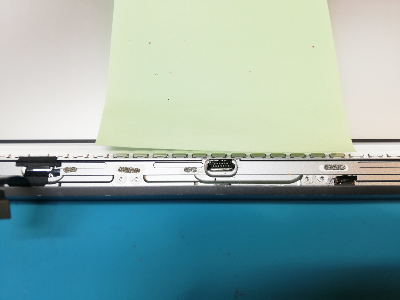 Il liquido ha raggiunto anche la parte inferiore del display, andando a danneggiare il cavo Flat responsabile della gestione della retroilluminazione.